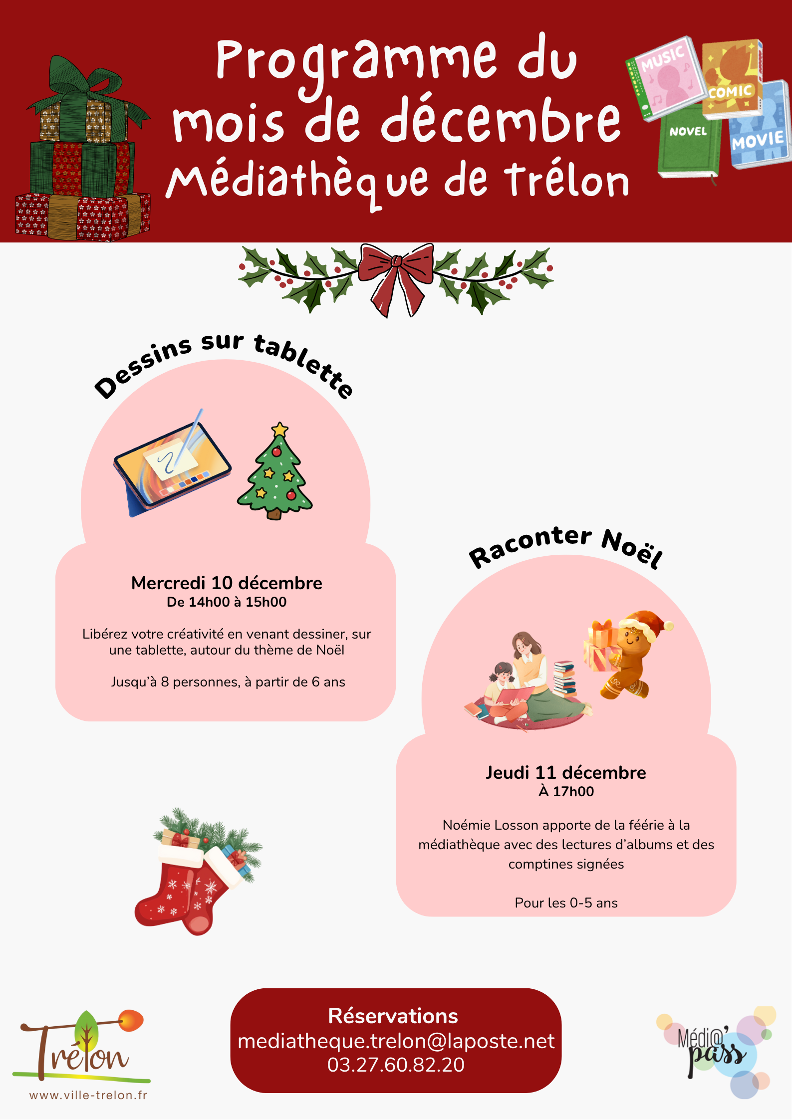 Noémie Losson apporte de la féérie avec ses comptines et ses albums autour de Noël. Jeudi 11 décembre à 17h00 pour les petits jusqu’à 5 ans. Inscriptions au 03.27.60.82.20 ou mediatheque.trelon@laposte.net