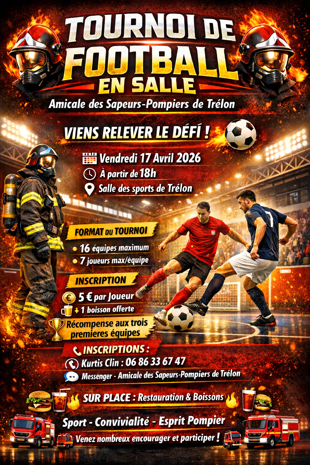Un tournoi de football en salle organisé par l’Amicale des Sapeurs-Pompiers se déroulera le vendredi 17 avril à la salle des sports de Trélon, début du tournoi à 18h00.